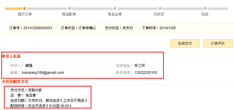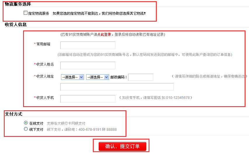 填写收货人信息 请您详细的填写收货人姓名、地址、联系方式,以便我们的工作人员能够将您选中的商品快捷、准确的配送到您的手中;